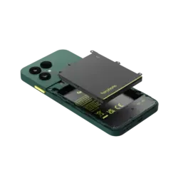 Unverwechselbares Design. Das Fairphone besteht aus einem matten recycelten Kunststoff, Gorilla Glass 7i und wurde nach Militärstandards auf Robustheit und Zweckmäßigkeit getestet.